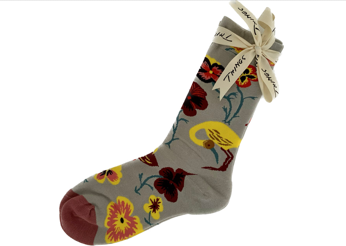Calcetín en tono topo con motivos florales en tonos amarillos naranja y mostaza.