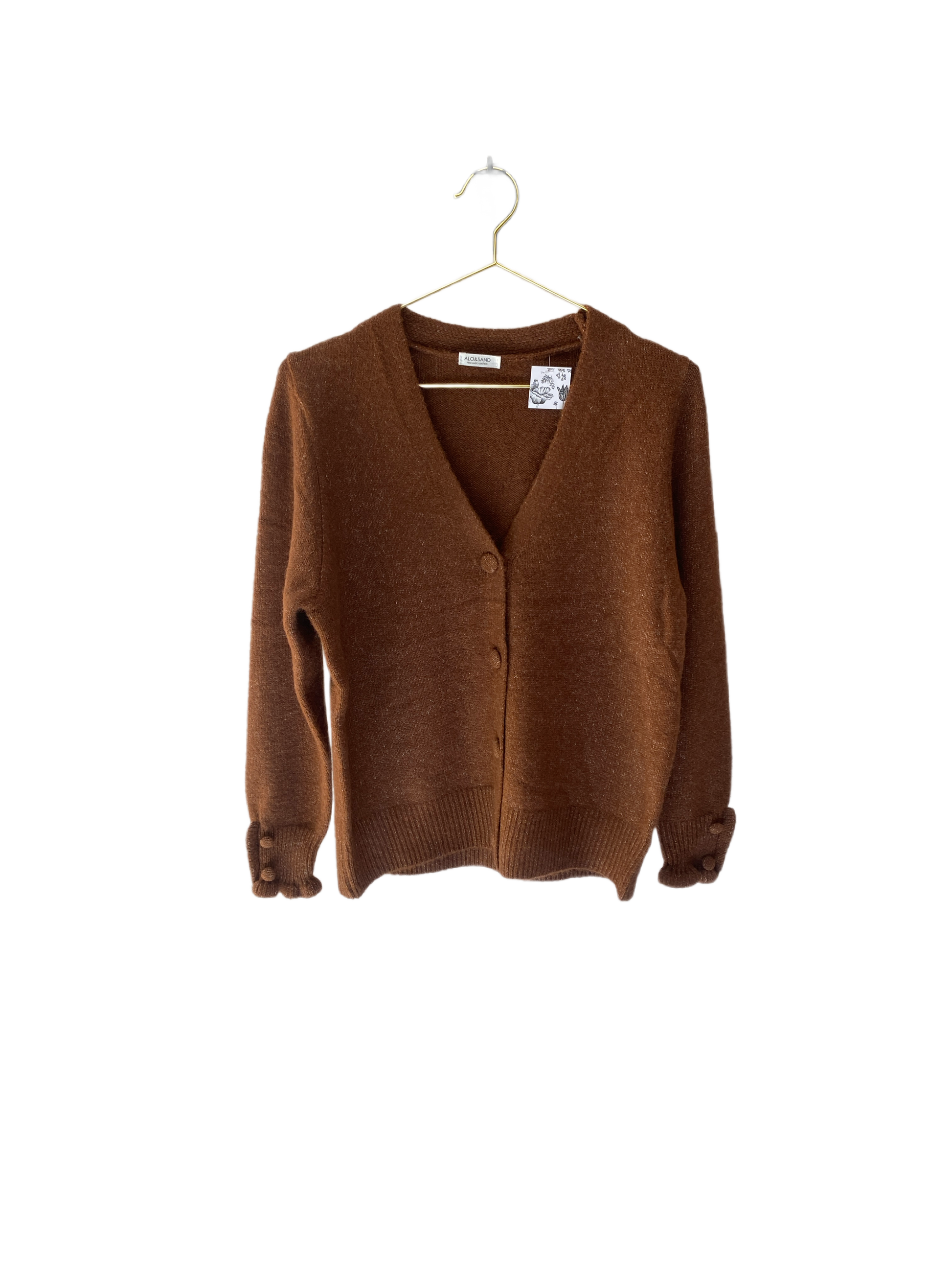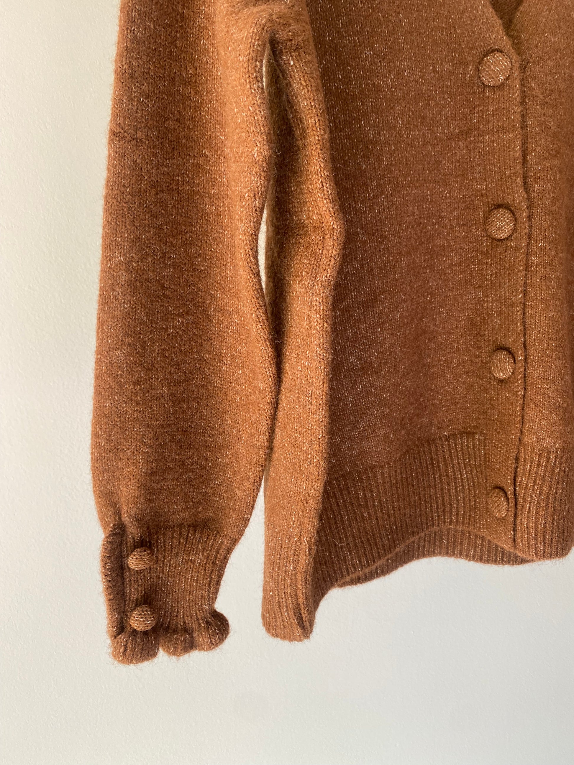 chaqueta de cuello pico con detalle de volante en el puño y botones forrados.