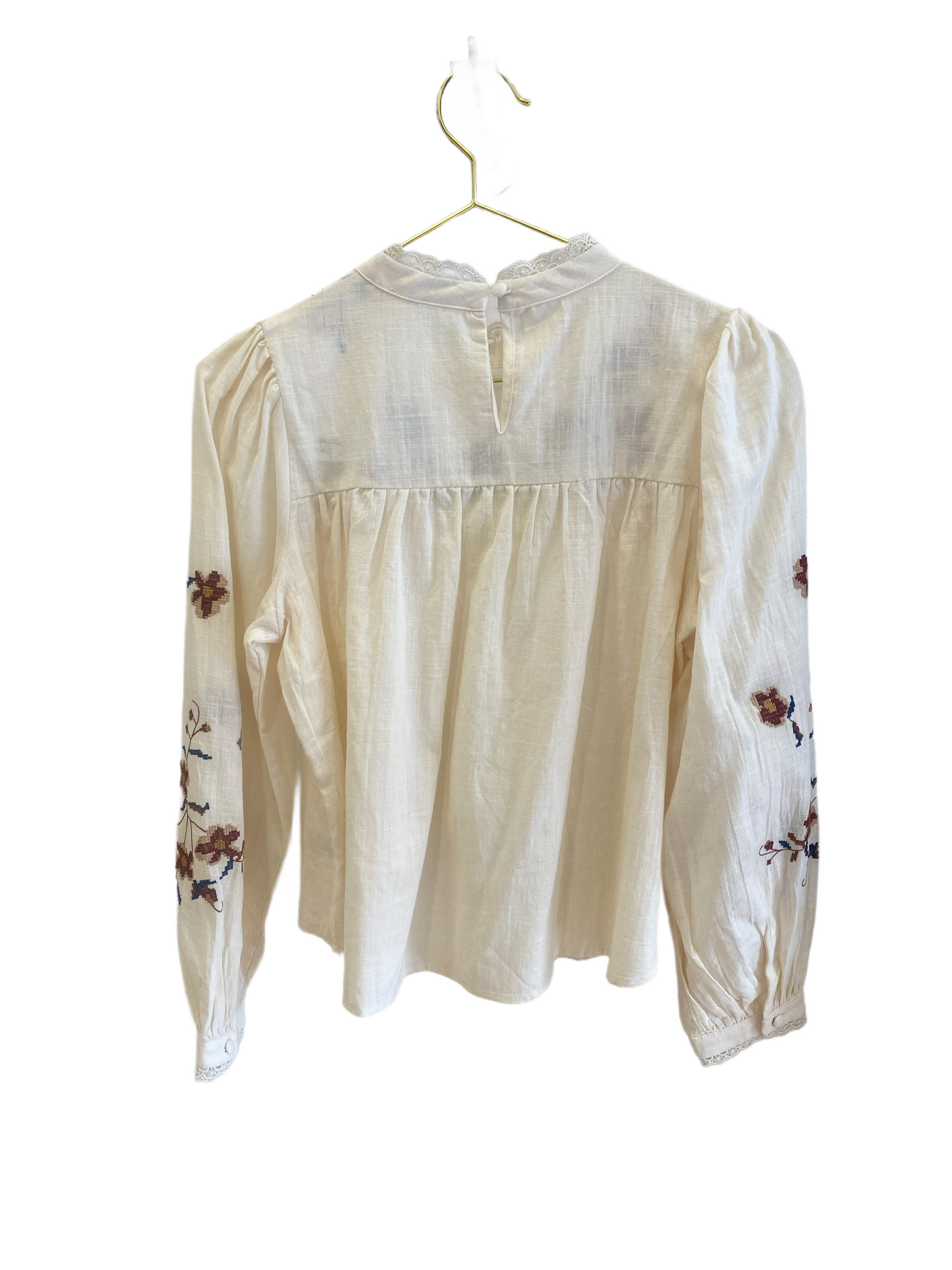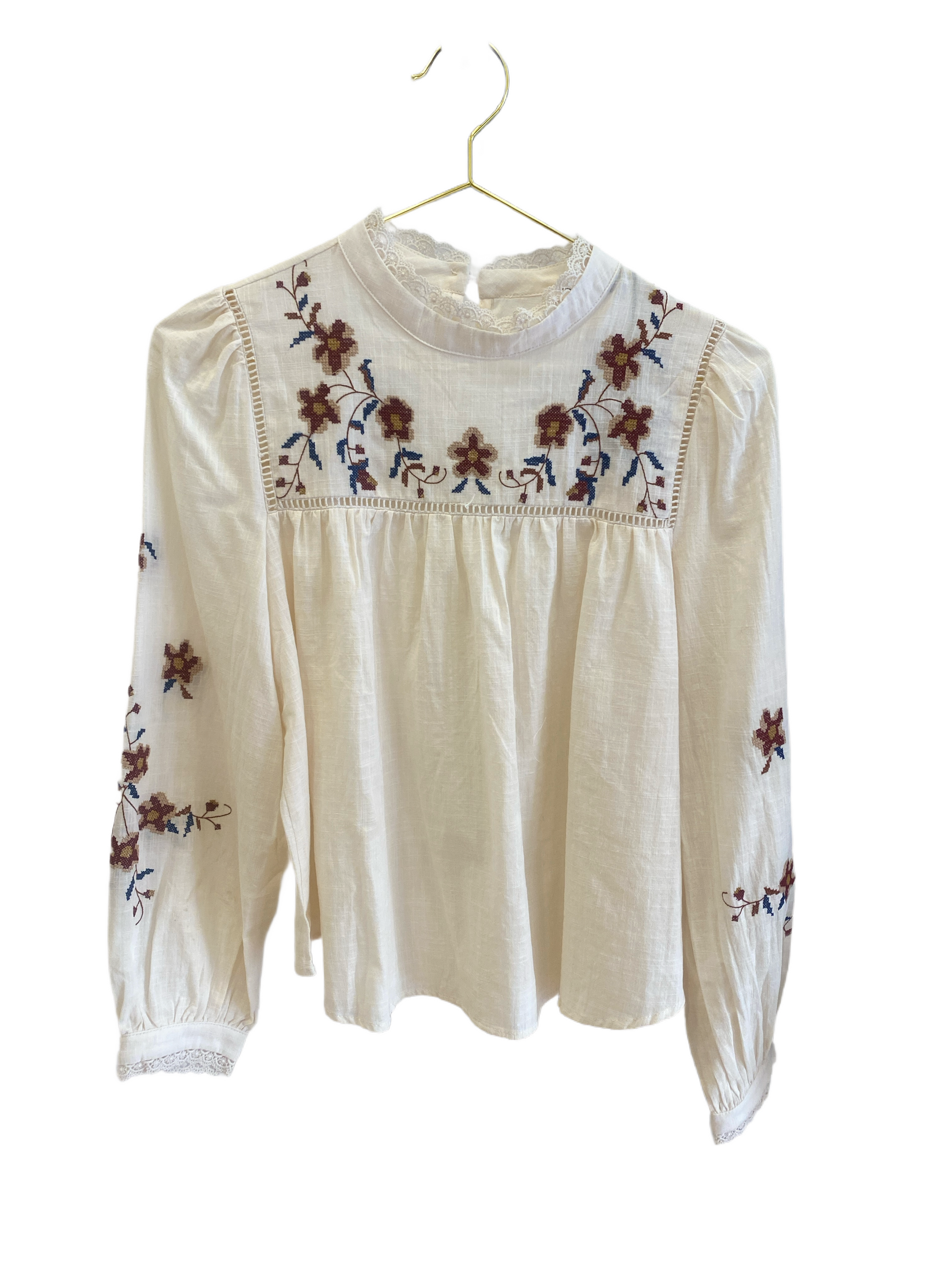 Camisa romántica con detalles en flores de punto de cruz en tono azul granate y marrón en fondo ecru.