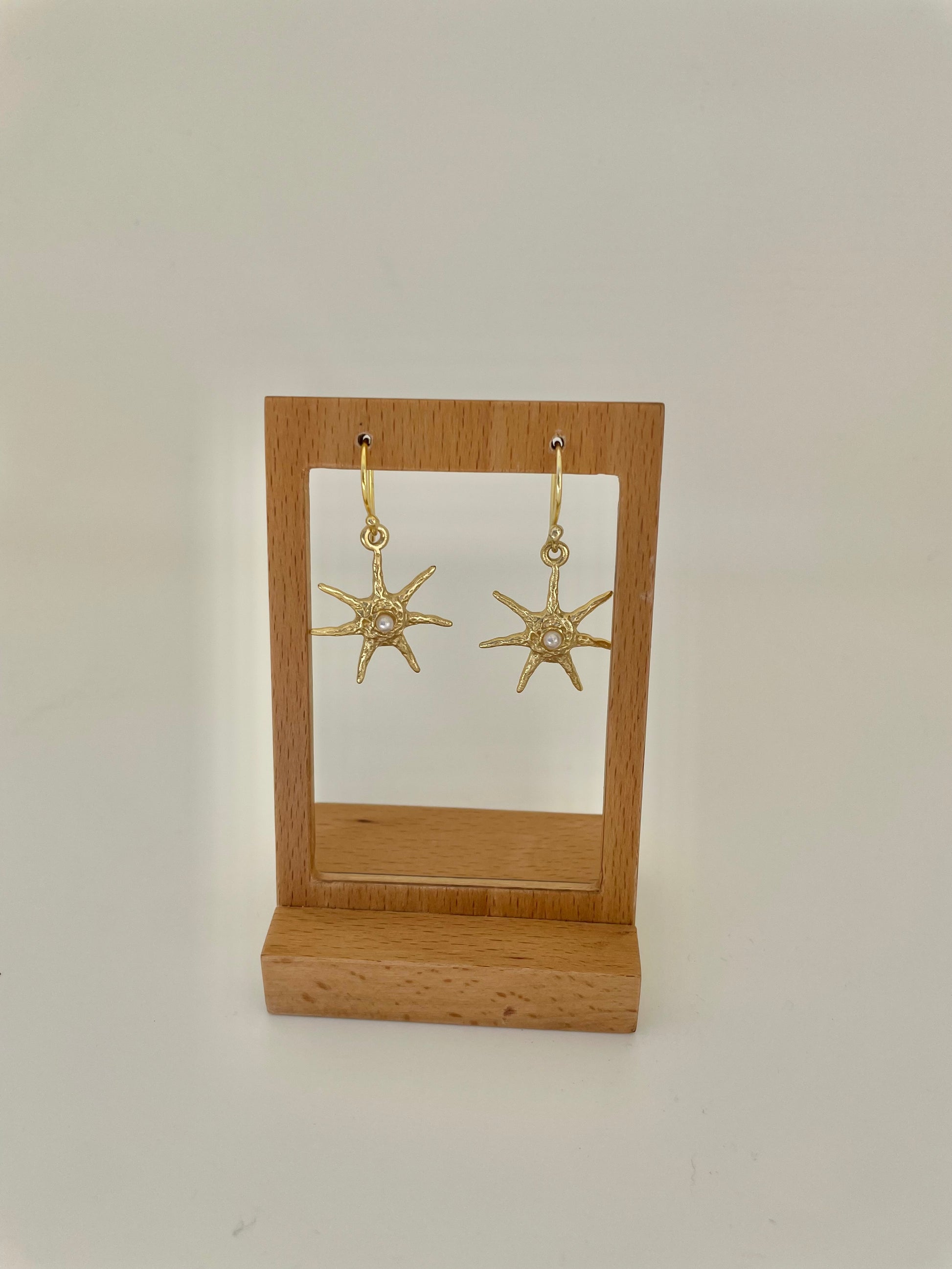 - Pendientes aros dorados con colgante de una estrella de mar y en medio una perla blanca.