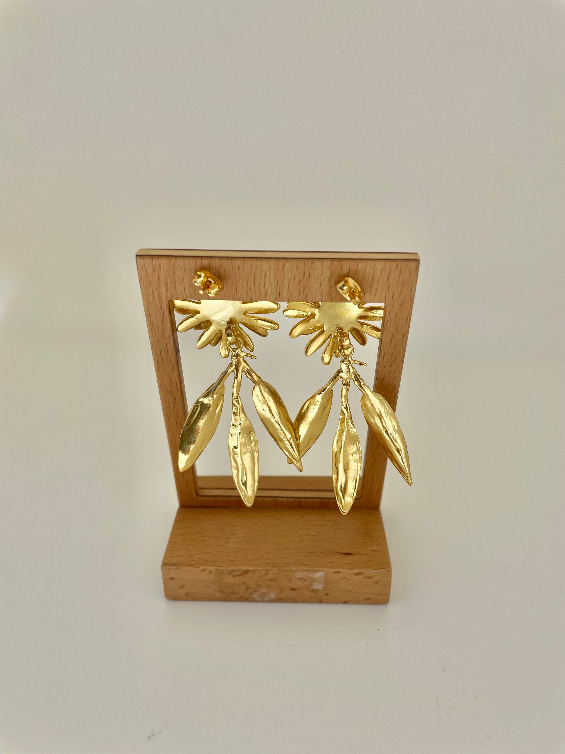 - Pendientes largos dorados simulando un girasol y hojas.