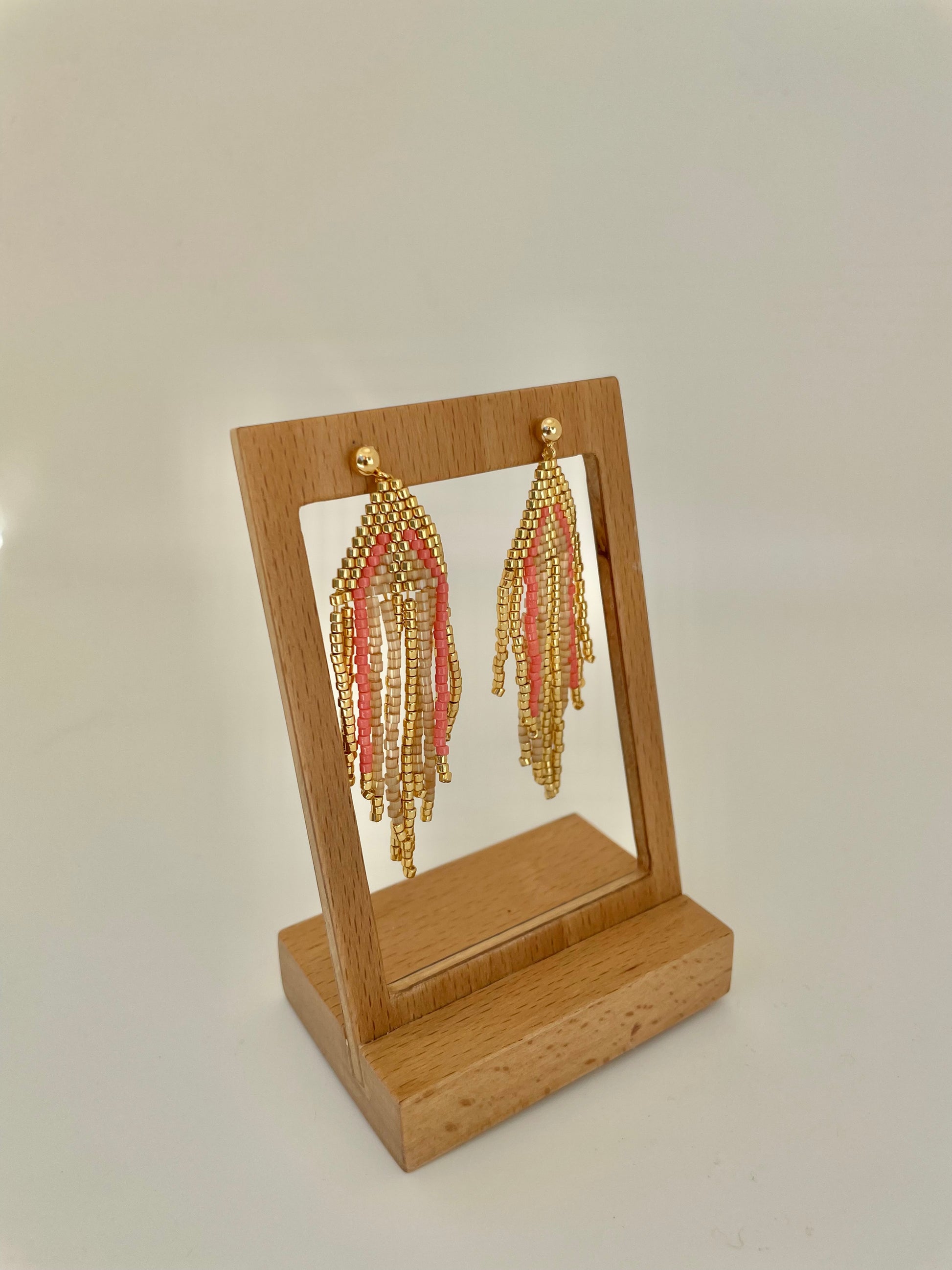 - Pendientes largos dorados con abalorios en tonos azules.
